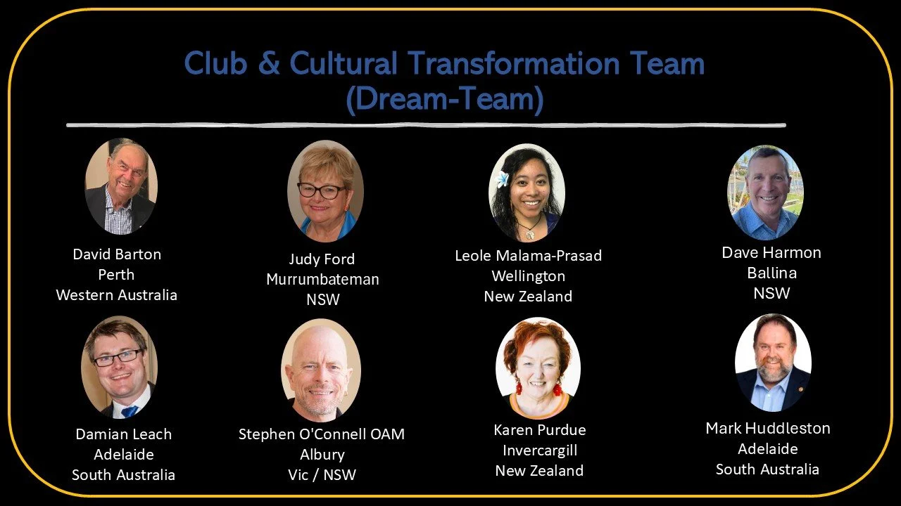 This diverse, skilled team is composed of 10 members from different districts, who bring a wealth of ‘hands on’ experience in starting new style clubs throughout Australia, New Zealand and the Pacific Islands. These frontline, new-style club start-up specialists are a resource available to leaders in our zone.