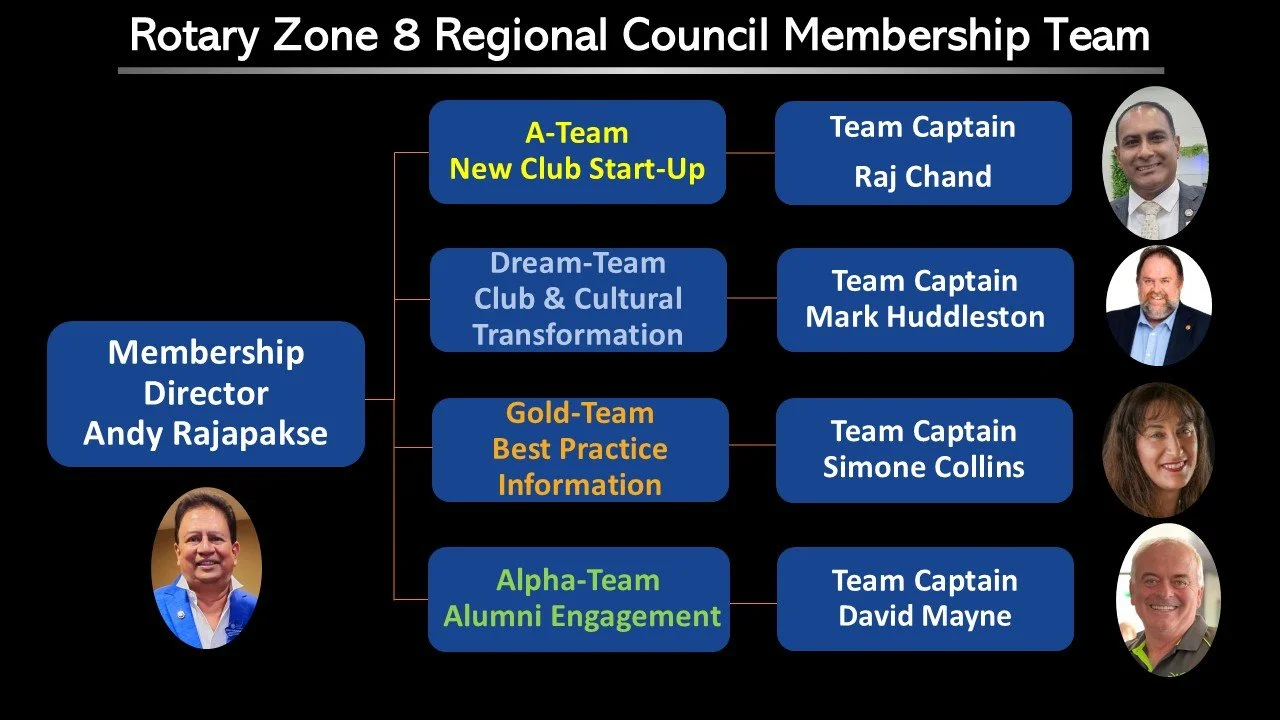 The team’s mission is to set a new trajectory in expanding Rotary’s reach across Zone 8. New club development is an essential part of growing Rotary, along with attracting and retaining members in our existing clubs. New style clubs in particular are essential for reaching new demographics that our traditional clubs may be unable to attract and retain.